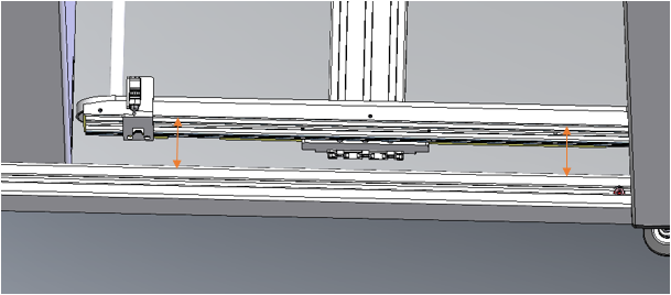 Zum Ausrichten der Achse wird zunächst die Parallelität der Transportbänder zum Gehäuse hergestellt. Es werden wie im Bild gezeigt die Abstände gemessen und durch Verdrehung der Achse die Parallelität eingestellt.